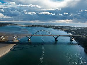 Cloudy day along the Oregon Coast, showcasing Alsea Bay Bridge. Shot of Mavic 3 Pro